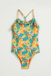Een geheel gevoerd badpak van een polyamidemix met een all-over bloemendessin, volants en elastisch, gekruiste schouderbandjes.