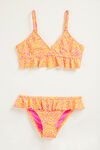 Een geheel gevoerde bikini met all-over bloemendessin. De top heeft een overslageffect op het voorpand en een kunststof sluiting op het achterpand. Zowel de top als het broekje heeft ruches.