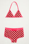 Een geheel gevoerde bikini met all-over dessin. De top heeft een kunststof sluiting op het achterpand en verstelbare bandjes.