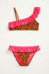 Een geheel gevoerde bikini met een all-over dessin. De top heeft een off-shoulder effect. Zowel de top als het broekje heeft ruches.