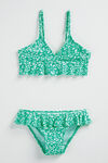 Een geheel gevoerde bikini met een fijne structuur en all-over luipaarddessin. De top heeft een overslageffect op het voorpand en een kunststof sluiting op het achterpand. Zowel de top als het broekje heeft ruches.