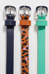Een set van drie ceinturen van imitatieleer met een metalen gesp. Breedte: 1.5 cm.