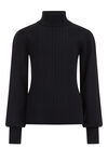 Een trui van een viscosemix met een ribstructuur. Het model heeft een col en lange mouwen.