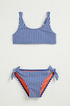 Een bikini met een all-over gestreept dessin, een fijne structuur en striksluitingen bij de schouderbandjes en bij de zijkanten van het broekje.