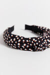 Een haarband van een geweven kwaliteit met een stippendessin en een knoopdetail.