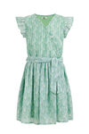 Een regular fit jurk van geweven kwaliteit met dessin, glittergaren en een strikceintuur. Het model een V-hals met drukknoopsluiting, een elastische taille en korte mouwen.