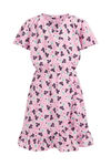 Een regular fit jurk van gerecycled polyester met een dessin en ruches. Het model heeft een V-hals met drukknoopsluiting en korte mouwen. De jurk heeft een nagemaakt overslageffect en elastische taille.