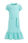 Een regular fit jurk van katoen met een streepdessin en strikceintuur. Het model heeft een ronde hals, korte mouwen en volant aan de onderkant.