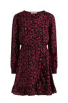 Een regular fit jurk van viscose met een dessin, volant en een drukknoopsluiting. Het model heeft een V-hals en lange mouwen. De jurk heeft een elastische taille en gesmokte boorden bij de mouwen.