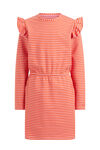 Een regular fit jurk van een katoenmix met een streepdessin, ruffels op de schouders en een elastische taille. Het model heeft een ronde hals, lange mouwen en twee steekzakken.