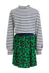 Een regular fit jurk van een katoenmix met een dessin, glittergaren en een embroidery op de mouw. Het model heeft een ronde hals, lange mouwen, een knoopsluiting op het achterpand en een elastische tailleband.