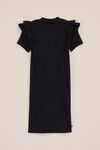 Voor meisjes die zich graag vrij bewegen. Deze jurk heeft een ronde hals, korte mouwen en speelse ruches die van de schouders naar het voorpand lopen — comfortabel én stijlvol, zonder dat het in de weg zit."