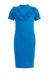 Een slim fit foto van een katoenmix met een ribstructuur en V-vormig broderie anglaise. Het model heeft een ronde hals en korte mouwen.