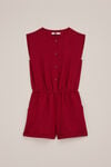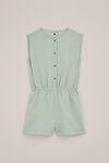 De shortcut naar een leuke outfit. Deze playsuit heeft een regular fit, ronde hals, drukknoopjes op het bovenstuk, elastiek in de taille, rechte pijpen en een speelse rimpelstructuur all-over.