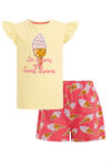 Een regular fit pyjamaset van katoenmix met een dessin en opdruk. Het T-shirt heeft een ronde hals en korte mouwen met ruches. Het broekje heeft een elastische taille en smalle pijpen.