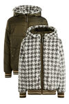 Deze winterjas kun je aan twee kanten dragen. De ene kant heeft een gewatteerde look met embroidery wat waterafstotend is en de andere kant is van imitatiebont met een dessin. Het model heeft een ritssluiting met kinberschermer, twee steekzakken met drukknoop en lange mouwen met geribde boorden.