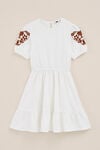 Eenvoudig silhouet, rijk aan details. Deze jurk heeft een reguliere pasvorm, een ronde hals en ballonmouwen met borduursel. De seersucker-stof en de elastische tailleband maken haar comfortabel en charmant. Precies de juiste mix van speels en chic.