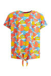 Een loose fit T-shirt van elastisch katoen met een all-over dessin een embroidery op de borst en een knoopdetail aan de onderkant. Het model heeft een ronde hals en korte mouwen.
