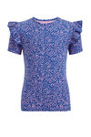 Een nauwsluitend T-shirt van een katoenmix met een dessin en volant. Het model heeft een ronde hals en korte mouwen.