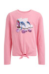 Een nauwsluitend T-shirt van een katoenmix met een pailletten applicatie met knoopdetail. Het model heeft een ronde hals en lange mouwen.