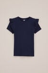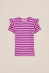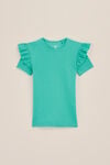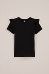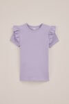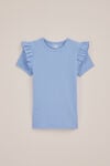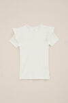 Dit charmante T-shirt is gemaakt van een zachte mix van biologisch katoen met een subtiele ribstructuur en schattige ruches. Het heeft een comfortabele ronde hals en luchtige korte mouwen.