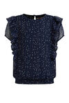 Een regular fit top van geweven kwalitiet met een dessin, volant en glittergaren. Het model heeft een ronde hals met een knoopsluiting, korte mouwen en gesmokte boorden,