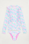 Een regular fit UV T-shirt van een polyamidemix met een dessin. Het model heeft een hoge hals en korte mouwen. Het heeft een broekje met een elastische taille.