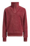 Een geribde sweater van velours kwaliteit met een embroidery. Het model heeft een openstaande kraag met ritssluiting, lange mouwen en ribboorden met glittergaren.