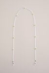 Schelpen, steentjes...alles kan een verzameling worden. Dit brillenkoord heeft transparante kralen met om de 6 cm een bloemetje, plus siliconen lusjes en een zilverkleurige karabijnhaak. Glinstert net zo hard als de vondsten in haar jaszak.